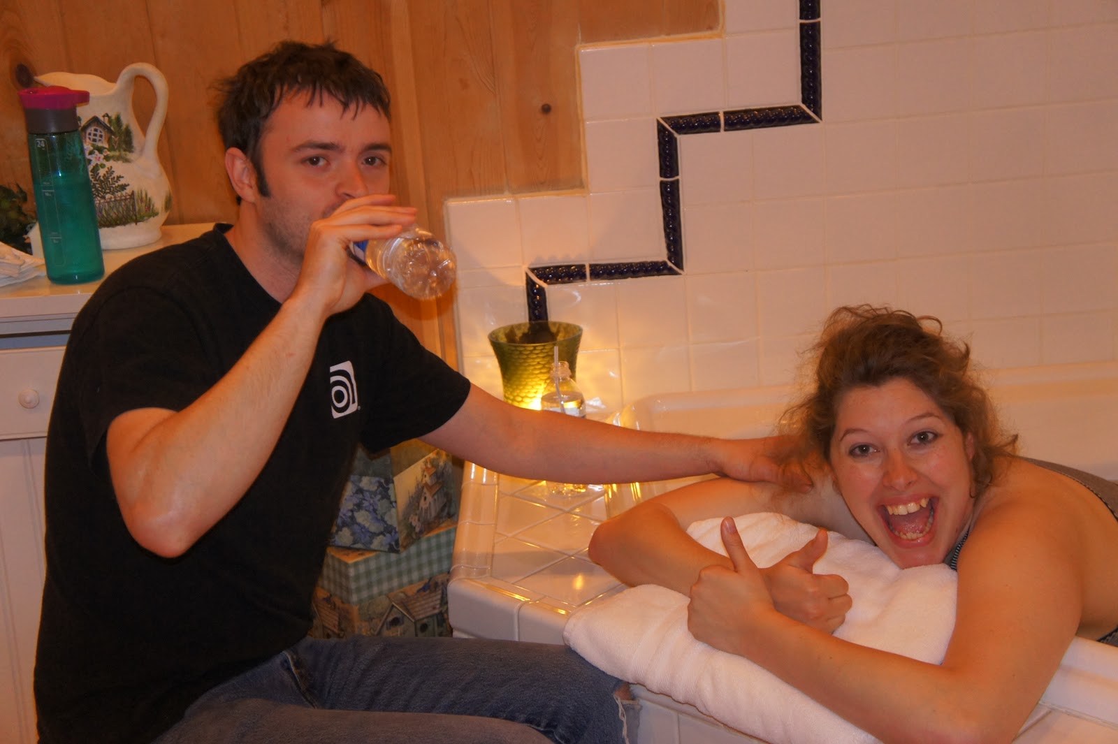 We got there a little after 7am. The room was warm and smelled yummy. They had soft music playing and the tub was filled with soothing hot water. I embraced Sean and started crying. "we are going to meet our baby." I said. It was a very special emotional time. When she checked me I was 7 cent. dialated which is where they want you when you come in. I was amazed that Kyla knew when to have me come in by how I sounded during a contraction. She rocks!